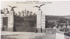 De plus, ce mur franchissait les ruisseaux, le cas avait été prévu et fort soigneusement … des portes en bronze ! Montées sur des pivots, basculaient pour laisser passer l’eau, puis se refermaient hermétiquement …. Ajoutez qu’à l’entrée du domaine, on avait placé un fabuleux portail (nous sommes en 1907 à SAINTE MAXIME !!) dont les deux piliers principaux étaient couronnés de grands oiseaux en bronze …. Cela devint “Le Domaine de l’Allemand” dont le portail était défendu par “Les deux Aigles de l’Allemand”. Il n’en fallait pas plus pour que les esprits s’échauffent et que les conversations aillent leur train … en particulier devant le comptoir ou sur la terrasse du “France” (entendez le café de France de la place Victor Hugo).